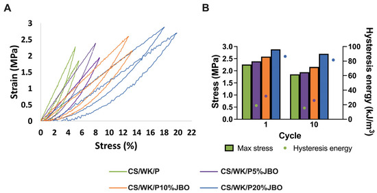 Adding juniper berry oil enhanced the material’s mechanical properties at all concentration levels. At a JBO content of 5%, an increase in initial stress and energy was observed compared to the control sample. However, the decreases after 10 cycles remained comparable (−19%), suggesting a partial improvement in mechanical properties but without complete protection against fatigue. The best properties were exhibited by the material containing 10% JBO (CS/WK/P10%JBO), which was characterized by the highest initial strength (2.88 MPa) and dissipated energy (86.4 kJ/m3), and after 10 cycles, these values decreased only slightly (−6% stress, −5.7% energy). Such a low level of degradation confirms the high resistance of the material structure to repeated mechanical loads. In the case of the CS/WK/P20%JBO sponge, favorable initial values were observed. However, the parameter decrease after 10 cycles was more pronounced (−16% stress, −17% energy), which may suggest excessive plasticization of the polymer network or a supersaturation effect.