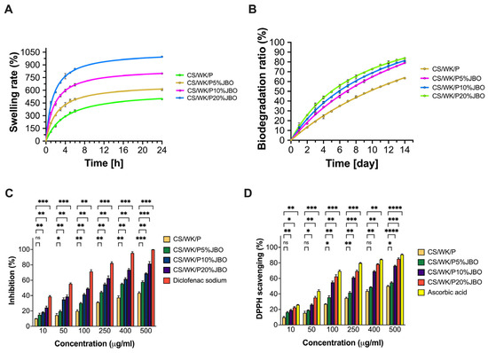 Properties of the sponges. Swelling rate (A), biodegradation rate (B), anti-inflammatory properties (C), and antioxidant properties (D). Statistical significance: ns (not significant), p < 0.05 (*), p < 0.01 (**), p < 0.001 (***), p < 0.0001 (****).