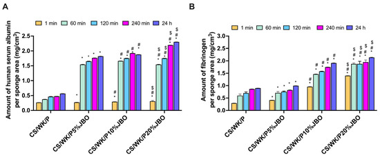 Protein adsorption on the obtained sponges. Amount of the HSA (A) and fibrinogen (B) bound on the materials. Symbols #, *, and $ indicate p < 0.05 when compared to CS/WK/P, CS/WK/P5%JBO, and CS/WK/P10%JBO, respectively.