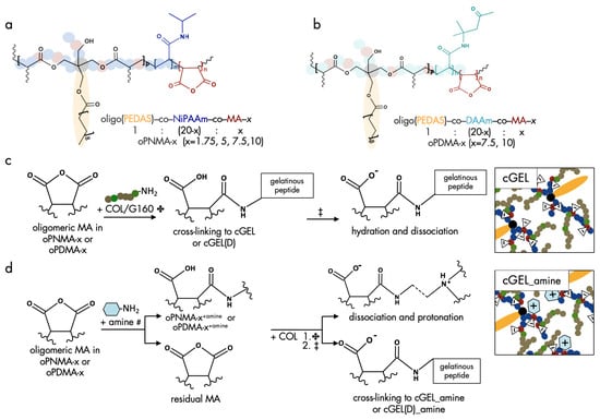 - Loth, T.; Hötzel, R.; Kascholke, C.; Anderegg, U.; Schulz-Siegmund, M.; Hacker, M.C. Gelatin-Based Biomaterial Engineering with Anhydride-Containing Oligomeric Cross-Linkers. Biomacromolecules 2014, 15, 2104–2118. [Google Scholar] [CrossRef]
