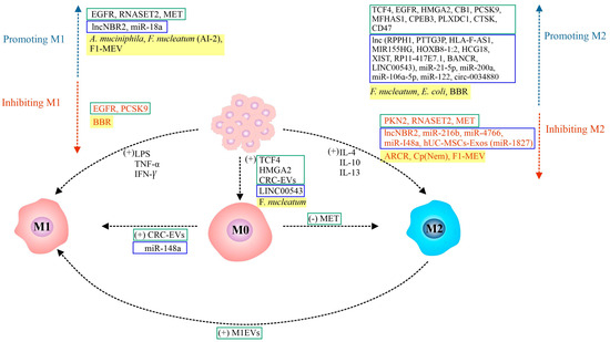 The role of the tumor-resident microbiota in modulating tumor immunity remains unclear. However, some bacteria or their metabolites may influence TAM polarization in CRC [97,144]. In most cases, bacterial involvement in TAM reprogramming occurs through well-known signaling pathways, e.g., NF-κB [145,146,147,148]. Colon microbiota often interact with selected ncRNAs [146,148]. For example, Akkermansia muciniphila (A. muciniphila), a SCFA-producing bacterium, promotes the expression of M1-like macrophages and has been suggested as a potential target in CRC therapy [145]. However, closer analysis suggests that the role of A. muciniphila in inhibiting the development and treatment of human CRC remains controversial (reviewed in [149]). Fusobacterium nucleatum (F. nucleatum) promotes macrophage infiltration by activating CCL20 while inducing M2 macrophage polarization. The mechanism of pro-metastatic action of this bacterium would be related to the reduction of miR-1322 expression by activating the NF-κB signaling in CRC cells and M2 macrophage polarization [146]. Other studies confirmed the role of F. nucleatum in M2 macrophage polarization and CRC progression through the mechanism of TLR4/NF-κB/S100A9 signaling activation [147].