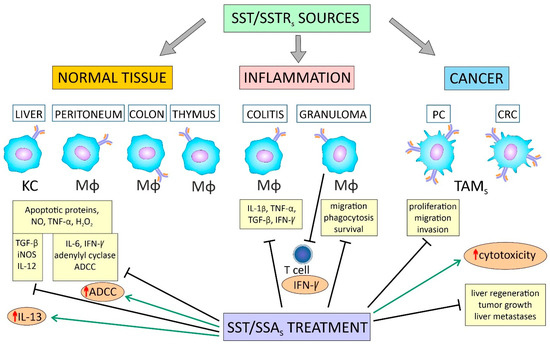 The growth hormone-releasing inhibiting peptide/somatostatin (SST/SRIF) system is an interesting system involved in the interactions between tumor cells and other TME cells in CRC. This system consists of seven genes encoding two peptide precursors, namely SST and cortistatin (CST), and five receptor genes (SST1-5) [15]. Notably, studies show that macrophages themselves also produce SST, which is considered one of the immunoregulatory cytokines in inflammation [16,17,18,19,20]. The main receptor type mediating the autocrine and paracrine effects of SST in immune cells, including macrophages, is SST2 [19,21,22,23]. This results in reduced phagocytic activity of human monocytes and macrophages [18,22,24]. While attempts have been made to use TAMs as a target for SST analog (SSA) therapy in the treatment of inflammation [25] and some human malignancies [26,27,28] with varying degrees of success, the role of TAMs as a target for SST system components in CRC therapy remains an open question.