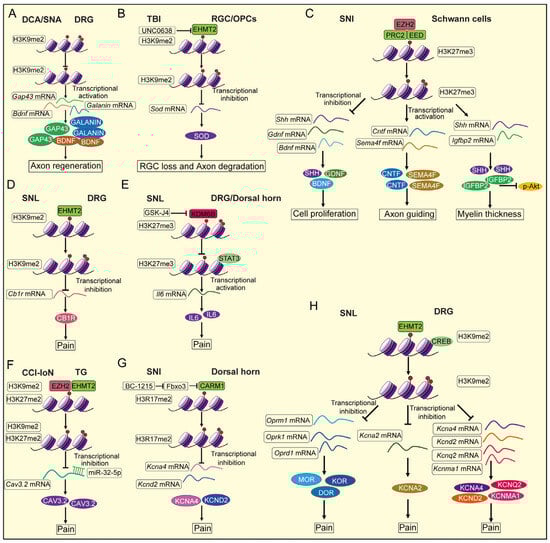 - Luo, Y.; Zhang, J.; Chen, L.; Chen, S.R.; Chen, H.; Zhang, G.; Pan, H.L. Histone methyltransferase G9a diminishes expression of cannabinoid CB(1) receptors in primary sensory neurons in neuropathic pain. J. Biol. Chem. 2020, 295, 3553–3562. [Google Scholar] [CrossRef]