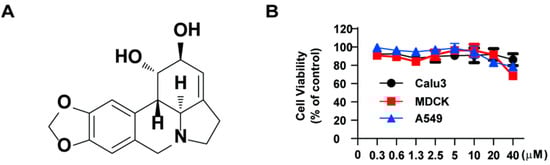 Chemical structure of lycorine and cytotoxicity assay. (A). Chemical structure of lycorine. (B). MDCK, A549, and Calu-3 cells were treated with lycorine at various concentrations. After 24 h, cytotoxicity was assessed using the CCK assay.