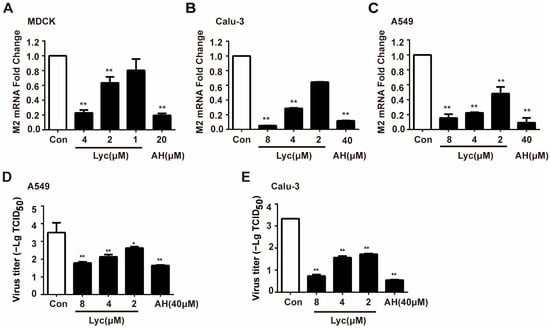 Quantification of anti-IAV effect of lycorine by qRT-PCR assay and viral titer determination. (A). MDCK, (B). Calu3, and (C). A549 cells were infected with IAV FM1 at multiplicities of infections (MOIs) of 0.002, 0.02, and 0.2, respectively, for 2 h and then treated with lycorine. AH was treated while infected. Total RNA was extracted, and the IAV M2 mRNA level was quantified using qRT-PCR. (D,E). A549 and Calu3 were infected with IAV at MOIs of 0.2 and 0.02, respectively, for 2 h and then added with lycorine. At 24 h post-infection, the cells were subjected to freeze–thaw cycles, and cell culture supernatants were collected. Viral titers were determined by cytopathic effects (CPE)-based TCID50 assay. Data are presented as means ± SD from triplicates of three independent experiments. * p < 0.05, ** p < 0.01 indicates a significant difference compared to the control (Con) group.