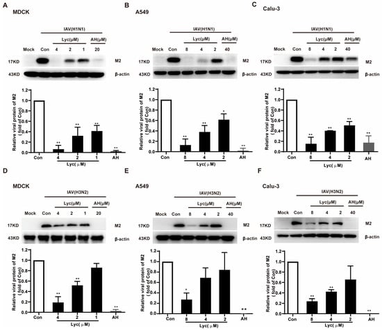 Lycorine inhibits H1N1 and H3N2 influenza virus replication at the protein level. MDCK, A549, and Calu-3 cells were infected with A/Fort Monmouth/1/1947 (FM1, H1N1) subtype (A–C) or A/Wuhan/359/95 (H3N2) subtype (D–F) at multiplicities of infection (MOIs) of 0.002 for MDCK, 0.2 for A549, and 0.02 for Calu-3. After 2 h of infection, the cells were incubated in the absence or presence of the indicated concentrations of lycorine for 24 h. AH was treated while infected. The protein levels of IAV M2 were analyzed by Western blot. The optical density ratio of the bands was quantified using the software ‘Image Lab 4.0’ (n = 2). * p < 0.05 and ** p < 0.01 indicate significant differences compared to the control (Con) group.