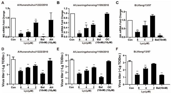 Effects of lycorine against drug-resistant strains of influenza virus and influenza B virus. (A). A/Hunanzhuhui/1222/2010, (B). A/Liaoningzhenxing/1109/2010, and (C). B/Jifang/13/97. MDCK cells were infected with IAV or IBV at MOI of 0.02 for 2 h and then treated with lycorine, Bal, and OC. AH was added while infected. Total RNA was extracted, and the IAV M2 or IBV HA mRNA level was quantified using qRT-PCR. (D–F). The same treatment was applied to the MDCK cells. At 24 h post-infection, the cells were subjected to freeze–thaw cycles, and cell culture supernatants were collected. Viral titers were determined by cytopathic effects (CPE)-based TCID50 assay. Data are presented as means ± SD from triplicates of three independent experiments. * p < 0.05 and ** p < 0.01 indicates a significant difference compared to the control (Con) group.
