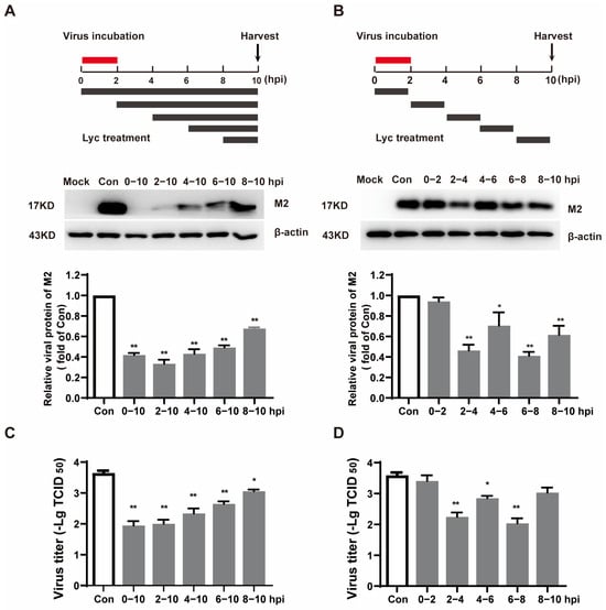 Lycorine targeted the post-entry stage of IAV infection. (A,B). A549 cells were infected with IAV (MOI = 5) at 0–2 h. Lycorine was treated at different time points above, and cells were collected at 10 hpi. IAV M2 was determined by Western blot. Software ‘Image Lab’ was used to analyze the optical density ratio of the bands (n = 2). (C,D). The same treatment was applied to the A549 cells. At 10 h post-infection, the cells were subjected to freeze–thaw cycles, and cell culture supernatants were collected. Viral titers were determined by cytopathic effects (CPE)-based TCID50 assay. * p < 0.05, ** p < 0.01 indicates significant difference from the Con group.