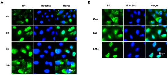 A 2 h treatment with lycorine at 6–8 h post-infection (hpi) significantly inhibited IAV replication, prompting further investigation into its mechanism. Previous studies have demonstrated that lycorine can inhibit the export of the ribonucleoprotein (RNP) complex of the IAV H5N1 subtype from the nucleus []. To explore this effect, we performed immunofluorescence analysis to monitor the intracellular localization of the viral nucleoprotein (NP) in A549 cells following infection. NP is a major protein component of the genomic viral ribonucleoprotein (vRNP) and serves as a key marker for tracking vRNP dynamics. As shown in Figure 6A, a very small portion of the NP protein localizes in the cell nucleus at 4 hpi, and it is predominantly concentrated within the nucleus by 6 hpi. At 8 hpi, a portion of the NP protein begins to export from the nucleus, and by 10 hpi, the majority of the NP protein exhibits a diffused distribution throughout the cytoplasm.