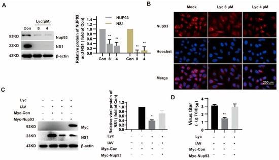 Lycorine affects the expression of Nup93. (A). A549 cells were treated with 8 µM and 4 µM lycorine with IAV infection at 0.2 MOI. Protein was harvested at 24 hpi and determined by Western blot. (B). A549 cells were treated with 8 μM and 4 μM of lycorine. Nup93 was detected by immunofluorescence. The cells were fixed and stained by Nup 93 antibodies. The fluorescent cells were observed by fluorescence microscope. (C). A549 cells transfected with Myc-Nup93 plasmid were infected with IAV at an MOI of 0.2 and treated with 4 μM of lycorine. Protein was harvested at 24 hpi, and viral NS1 was determined by Western blot. Software ‘Image Lab’ was used to analyze the optical density ratio of the bands (n = 2). (D). At 24 h post-infection, the cells were subjected to freeze–thaw cycles, and cell culture supernatants were collected. Virus titers were determined by cytopathic effects (CPE)-based TCID50 assay. * p < 0.05, ** p < 0.01 indicates significant difference from the Con group.