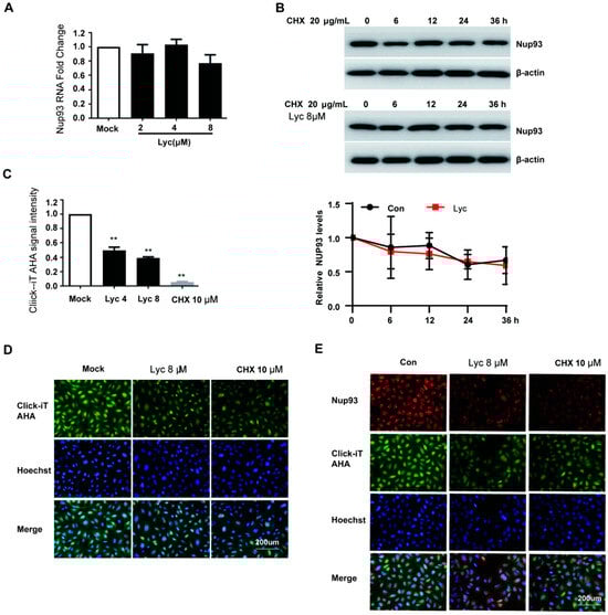 Lycorine inhibits the nascent synthesis of Nup93 protein. (A). A549 cells were treated with lycorine. Total RNA was extracted, and the Nup93 mRNA level was measured by quantitative RT-PCR. (B). A549 cells were incubated with cycloheximide (CHX, 20 μg/mL) and/or lycorine 8 μM for indicated times. Nup93 protein expression was analyzed by Western blot. Software ‘Image Lab’ was used to analyze the optical density ratio of the bands (n = 2). (C,D). A549 cells were treated in L-methionine-free media and 100 μM Click-iT AHA for 2 h with Lycorine (8 μM, 4 μM), or CHX (10 μM). (E). A549 cells were infected with IAV at an MOI of 0.2 and treated with lycorine (8 μM) or CHX (10 μM). Cells were washed, fixed, and permeabilized, and nascent protein synthesis was detected following a click reaction with Alexa Fluor 488 alkyne according to the manufacturer’s protocols. Imaging and quantitative analysis was performed using the fluorescence microscope and multimode plate reader platform. ** p < 0.01 indicates significant difference.