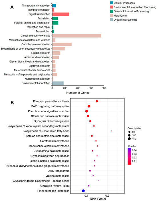 To identify the metabolic pathways linked to DEGs, KEGG pathway analysis was executed. A total of 2698 DEGs were assigned to 126 metabolic pathways, which were categorized into five major groups: cellular processes, environmental information processing, genetic information processing, metabolism, and organismal systems (Figure 5A, Supplementary Table S2). Using a statistical threshold of Q ≤ 0.05, 19 metabolic pathways were identified as significantly enriched. These pathways primarily involved phenylpropanoid biosynthesis, MAPK signaling, and plant hormone signal transduction (Figure 5B).