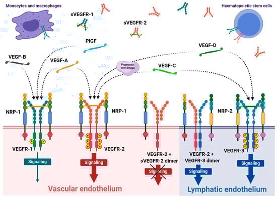 Vascular endothelial growth factor receptors (VEGFRs) are membrane-bound receptor tyrosine kinase proteins critical for the regulation of angiogenesis, vascular permeability, lymphangiogenesis, the differentiation and proliferation of cells, and the formation of tissues []. The VEGFR family consists of three main receptors (VEGFR-1, VEGFR-2, VEGFR-3) that bind to five corresponding structurally related VEGF ligands (VEGFA, VEGFB, VEGFC, VEGFD, and placental growth factor [PlGF]). Each ligand–receptor interaction activates distinct signaling pathways that promote cellular processes such as proliferation, migration, and survival, which are essential for vascular and lymphatic system development and maintenance [,]. VEGFR-2, for instance, is primarily responsible for mediating angiogenic responses, while VEGFR-3 is more involved in lymphangiogenesis (Figure 1) [,,]. The precise regulation of these signaling interactions is crucial for normal physiological functions; however, dysregulation of the signal pathways is linked to a variety of diseases, such as cancer, inflammatory disorders, and cardiovascular diseases []. Due to their pivotal role in vascular and lymphatic biology, VEGFRs and their ligands are major targets for diagnostic and therapeutic interventions aimed at treating these conditions [].