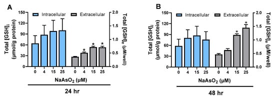 Effect of arsenite on astrocyte GSH levels. Primary cortical astrocytes (n = 6–9 from 2–3 separate dissections) were treated with increasing concentrations of NaAsO2 for 6 h. The NaAsO2 was removed by washing, and the cultures were incubated for either 24 h (A) or 48 h (B). Data are expressed as mean µmol/g protein + SEM normalized to protein content in each individual well (intracellular) or mean µM/well + SEM (extracellular). Intracellular GSH levels were analyzed by the Kruskal–Wallis test followed by Dunn’s test for multiple comparisons. Extracellular GSH concentrations were analyzed by ordinary one-way ANOVA followed by Šídák’s test for multiple comparisons. No significant changes in intracellular levels were observed between any groups at either time point. An asterisk (*) denotes extracellular concentration values significantly different from untreated cells (0µM) only [(A) 0 vs. 4 µM, p = 0.0049; 0 vs. 15 µM, p < 0.0001; 0 vs. 25 µM p < 0.0001; (B) 0 vs. 15, p < 0.0001; 0 vs. 25 p < 0.0001].