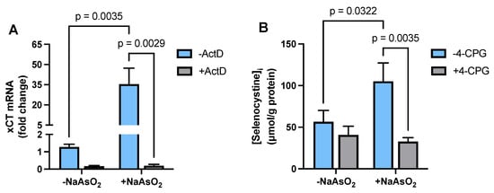 Effect of arsenite on astrocyte xCT mRNA expression and transporter activity. (A) Primary cortical astrocytes (n = 3 from 3 separate dissections) were treated with 10 µg/mL ActD (+ActD; gray bars) or its vehicle (−ActD; blue bars). Thirty minutes later, NaAsO2 was spiked into experimental wells to a final concentration of 15µM. After 4 h, RNA was isolated, and xCT mRNA expression was determined by RT-qPCR. Data are expressed as mean + SEM fold change in xCT mRNA over untreated cells (−NaAsO2, −ActD; =1). (B) Primary cortical astrocytes (n = 4 from separate dissections) were treated with NaAsO2 (15µM) for 24 h. Selenocystine (25 µM) was added to the cultures in the absence (−4-CPG, blue bars) or presence (+4-CPG, gray bars) of 4-CPG (500 µM) for 30 min. Cells were washed in methanol to permeabilize their plasma membranes, after which cellular extracts were collected and selenocystine concentration quantified, as described in the Section 4. Exact p-values are shown for each pairwise comparison that was determined to be significant by two-way ANOVA followed by Fisher’s uncorrected LSD test for multiple comparisons.