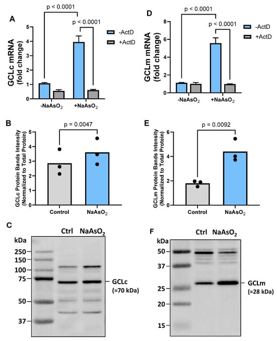 While increased substrate availability alone could potentially explain the enhanced GSH accumulation observed in astrocyte medium upon arsenite exposure [], we next sought to explore the role of other key components of the GSH synthetic pathway. First, we assessed mRNA expression for glutamate-cysteine ligase (GCL), the enzyme that catalyzes the first committed step of GSH synthesis [,,]. Astrocytes treated with 15µM arsenite experienced an increased steady-state mRNA level of both the catalytic (GCLC) and modifying (GCLM) subunit of GCL. Importantly, this upregulation was found to be transcriptionally mediated (Figure 3A,D). To determine whether the increased mRNA levels led to corresponding increases in protein expression, we performed a Western blot analysis. As shown in Figure 3B,E, we observed a significant increase in the protein levels of both GCL subunits, confirming that the elevated mRNA was indeed translated into higher protein expression.