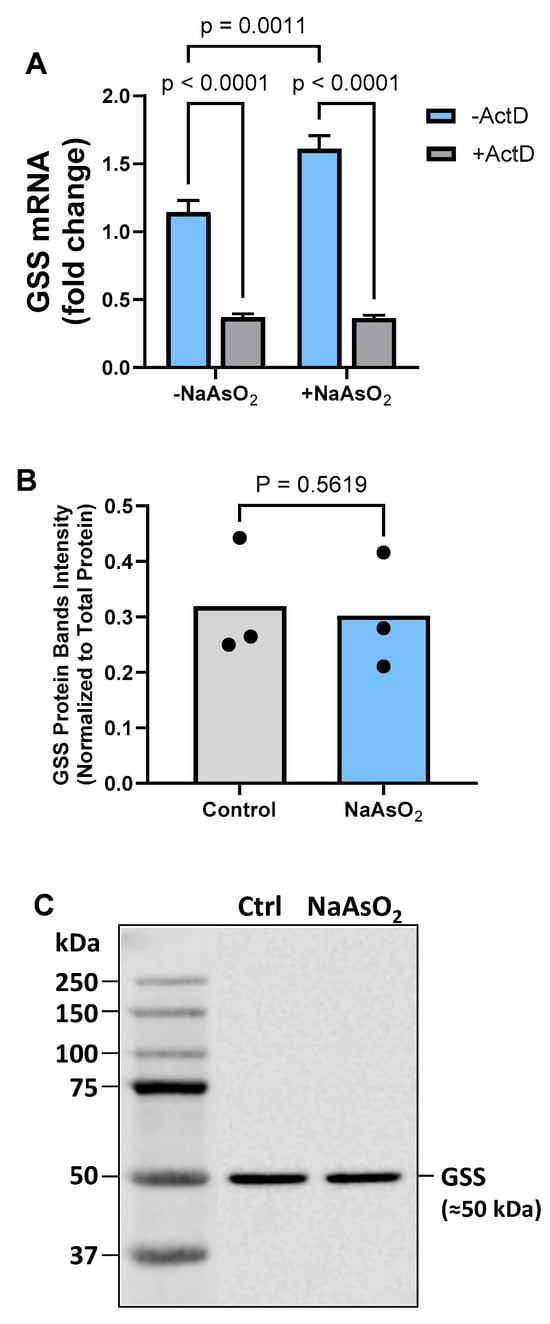 Effect of arsenite on astrocyte GS mRNA and protein expression. (A) Primary cortical astrocytes (n = 3 from 3 separate dissections) were treated with 10 µg/mL ActD (+ActD; gray bars) or its vehicle (−ActD; blue bars) for 30 min, after which NaAsO2 was spiked into experimental wells to a final concentration of 15µM. Four hours later, RNA was isolated, and GS mRNA expression was determined by RT-qPCR. Data are expressed as mean + SEM fold change in GS mRNA over untreated cells (−NaAsO2, −ActD). Exact p-values are shown for each pairwise comparison that was determined to be significant, as assessed by two-way ANOVA followed by Fisher’s uncorrected LSD test for multiple comparisons. (B) Protein expression of GS was assessed by Western blotting, as described in the Section 4. No significant changes in GS protein were determined by a paired t-test. (C) Representative blot for GSS.
