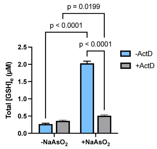 Taken together, our data indicates that arsenite upregulates key components of the GSH synthetic pathway primarily through transcriptionally dependent mechanisms. Therefore, we hypothesized that inhibiting transcription would prevent the observed arsenite-induced increase in extracellular GSH accumulation. Indeed, treatment of the astrocyte cultures with ActD (10 µg/mL) blocked [GSH]e accumulation in media from astrocytes exposed to 15 µM arsenite (Figure 5).