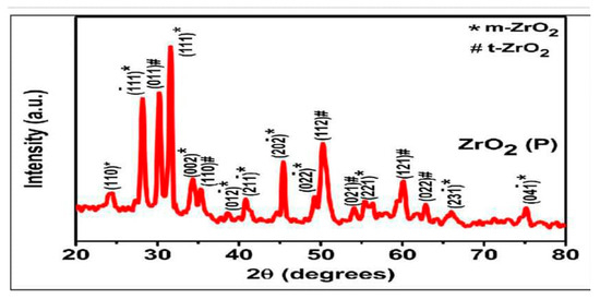 where k is a constant and is assumed to be 0.9 for spherical particles; λ is wavelength of X-ray used—in this case, the value is 0.15406 nm; β is the FWHM (the full width of the selected peak at half maxima); and θ is the angle of the peak (Figure 1). The total number of peaks observed = 08, whereas the average particle size was found to be 13.7 nm. The XRD displayed a very strong peak at ~32° that corresponded to the 011 plane of ZrO2. Next, a peak at ~34° was due to the 002 plane of ZrO2, showing the monoclinic form of zirconia. Another smaller peak at ~49 corresponds to ZrO2 (020). Peaks through ~59–60° are those of 121 planes of ZrO2, indicating the tetragonal form of zirconium oxide nanoparticles. These findings are similar to the characterization studies published previously [21,22,23].