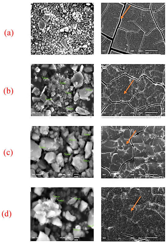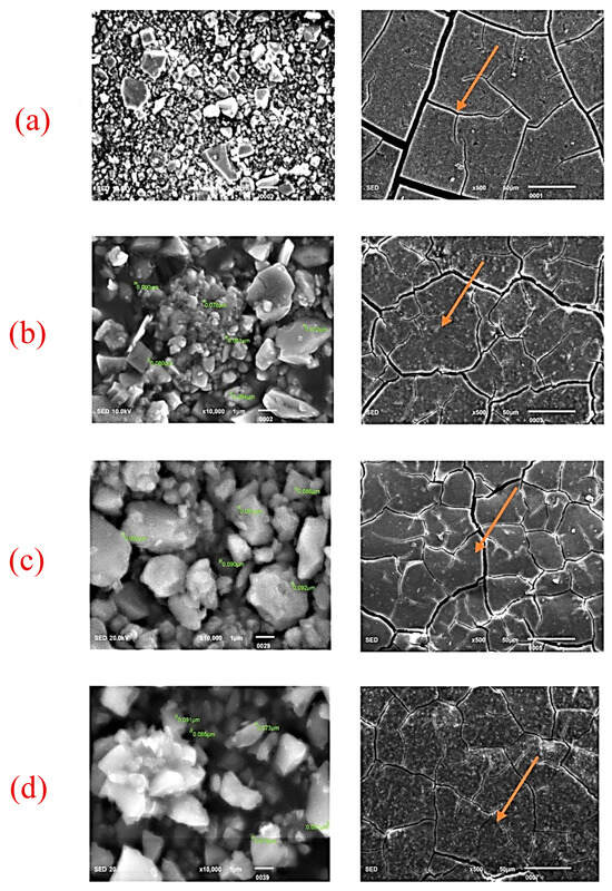 SEM images for SHOFU GIC (powder and disk). (a) Control (0%), (b) 2% nano-ZrO2 particles, (c) 5% nano-ZrO2 particles, and (d) 7% nano-ZrO2 particles. The disc form clearly depicts that the control group shows cracks, which were wider but were not improved by the addition of nano-ZrO2 particles (Figure 3a–d) (orange arrow).