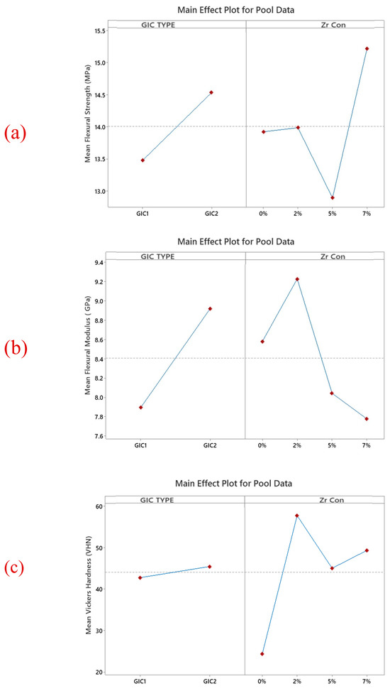 The main effects of the combined (a) flexural strength, (b) flexural modulus, and (c) surface hardness data, highlighting the effect of material type and nano-ZrO2 concentration. In general, GIC 2 appears to be stronger than GIC 1. Moreover, the addition of 7% nano ZrO2 shows an increase in the flexural strength and modulus and a decrease in the surface hardness of GICs.