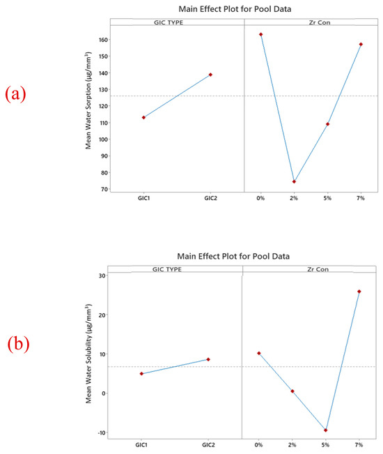 The main effects graphs of combined (a) water sorption (b) water solubility data highlight the effect of material type and nano-ZrO2 concentration. In general, GIC 1 has lower water sorption and solubility than GIC 2. Moreover, the addition of 7% nano ZrO2 shows decreased water sorption, whereas water solubility was increased.
