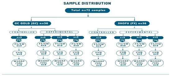 Seventy-two (n = 72) specimens of different sizes and shapes for different types of physio-mechanical evaluation were prepared using stainless steel molds. To determine flexural strength and flexural modulus, twenty-four (n = 24) bar-shaped specimens were used (2 × 2 × 25 mm); for Vickers microhardness, twenty-four (n = 24) disc-shaped specimens (4 × 6 mm) were used; and for water sorption and solubility, twenty-four (n = 24) disc-shaped samples (15 × 1 mm) were prepared (Figure 6). Samples were prepared at room temperature in 70% relative humidity. Powder and liquid were mixed according to the manufacturer’s recommendation and then placed in their respective stainless-steel molds. Before being removed from the mold, the specimens were left to dry at room temperature for 20 min. Prior to testing, they were coated with a protective varnish (G-C Dental Industrial Corp., Tokyo, Japan) and stored at 37 °C for 24 h in distilled water.