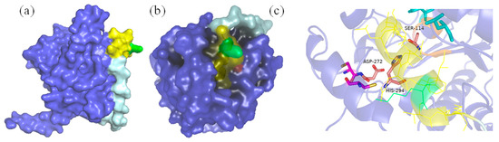 Figure 3). Molecular modeling revealed that the N-terminal fusion of SnoopTag resulted in its unexpected insertion into the catalytic pocket of PFL lipase. The primary helix of SnoopTag, which normally projects outward for SnoopCatcher binding, directly occupied the enzyme’s active site, creating steric clashes for the SnoopTag’s binding interface and PFL’s substrate-access channel. This structural conflict explains why N-terminal fusions failed to bind SnoopCatcher, whereas C-terminal fusion, in which the α-helical bundle of SnoopTag remained fully solvent-exposed, maintained high conjugation efficiency. Based on these findings, the C-terminal fusion, i.e., PSNT, was selected for subsequent experiments and characterization.