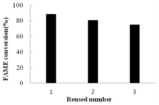w) (Aw = 0.72), and a reaction duration of 72 h at 45 °C with continuous agitation (200 rpm). Quantitative gas chromatography (GC) analysis was conducted using methyl salicylate as the internal standard. The calibration was performed with a mixture of three methyl esters (methyl palmitate, methyl oleate, and methyl linoleate), whose formation in the biodiesel synthesis process was confirmed. The final conversion rate of fatty acid methyl esters (FAME) reached 88.5%. Following the retrieval of PFL-immobilized magnetic particles and their subsequent application to two successive catalytic cycles, the FAME conversion rate exhibited a slight decline while remaining above 75% (