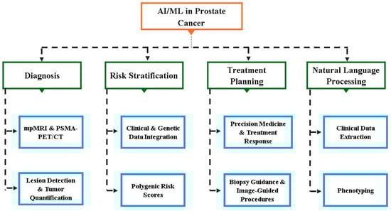 - Rabaan, A.A.; Bakhrebah, M.A.; AlSaihati, H.; Alhumaid, S.; Alsubki, R.A.; Turkistani, S.A.; Al-Abdulhadi, S.; Aldawood, Y.; Alsaleh, A.A.; Alhashem, Y.N.; et al. Artificial Intelligence for Clinical Diagnosis and Treatment of Prostate Cancer. Cancers 2022, 14, 5595. [Google Scholar] [CrossRef]