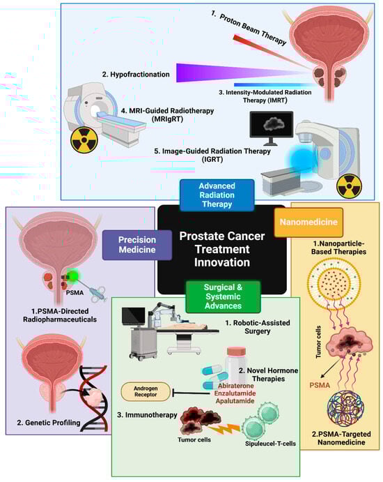 - Ibraheem, N.; Abdelglil, M.; Wanees, A.; Aosmali, A.M.; Shahid, M.H.; Mithany, R.H. Innovations and Emerging Trends in Prostate Cancer Management: A Literature Review. Cureus 2024, 16, e73128. [Google Scholar] [CrossRef]