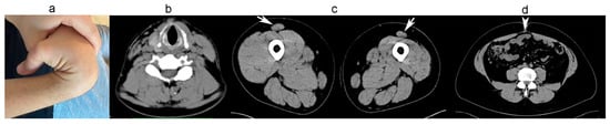 Clinical photo and muscle imaging of the 41-year-old patient from family B: (a) joint hypermobility; (b) MRI showing fibro adipose tissue between the markedly atrophic neck muscles (asterisks); (c) CT showing round bilateral hypotrophy of rectus femoris muscle (arrows). Left thigh muscles are more involved; (d) diastasis of the abdominal muscles (arrowhead), partial fibro-adipose replacement of abdominal and lumbar paravertebral muscles.