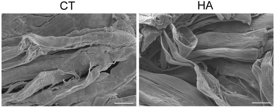 SEM images of reticular dermis in control (CT) and hyaluronic acid-treated (HA) skin at 24 h. Note the looser arrangement and the tortuous pattern of collagen in HA. Bars, 20 µm.