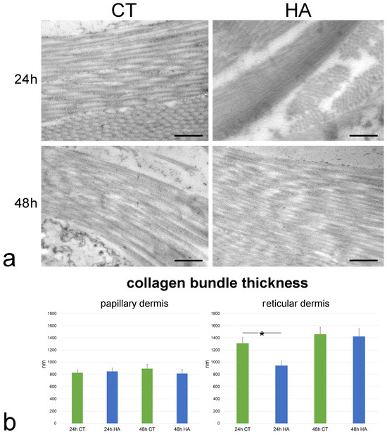(a) TEM images showing collagen bundles in the reticular dermis of control (CT) and hyaluronic acid (HA)-treated skin. Bars, 500 nm. (b) Mean ± SE values (n = 40) of collagen bundle thickness in papillary and reticular dermis of control (CT) and hyaluronic acid-treated (HA) skin samples at 24 and 48 h. The asterisk (*) indicates a statistically significant difference between HA-treated samples and the relative CT.