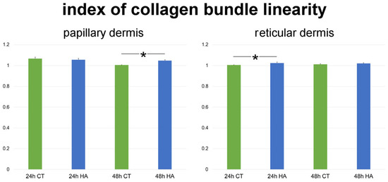 Mean ± SE values (n = 40) of the index of collagen bundle linearity in papillary and reticular dermis of control (CT) and hyaluronic acid-treated (HA) skin samples at 24 and 48 h. Asterisks (*) indicate statistically significant differences between HA-treated samples and the relative CT.