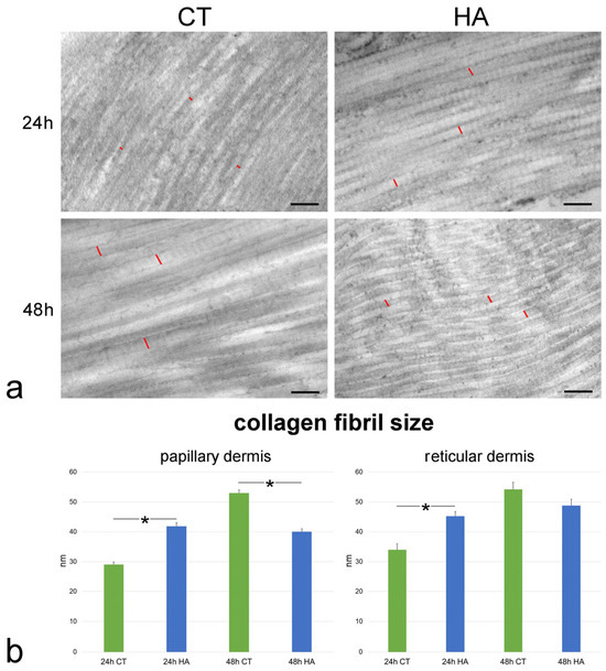 (a) TEM images of collagen fibrils in the papillary dermis of control (CT) and hyaluronic acid (HA)-treated skin. Red lines indicate the size of some collagen fibrils. Bars, 200 nm. (b) Mean ± SE values (n = 40) of collagen fibril size in papillary and reticular dermis of control (CT) and hyaluronic acid-treated (HA) skin samples at 24 and 48 h. The asterisks (*) indicate a statistically significant difference between HA-treated samples and the relative CT.