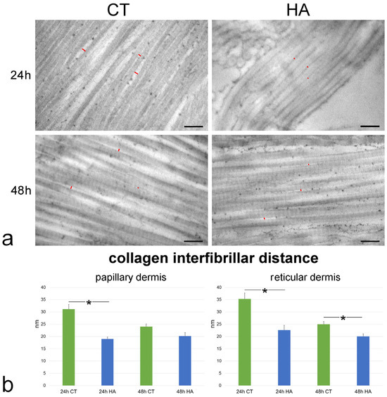 (a) TEM images showing collagen fibrils in the reticular dermis of control (CT) and hyaluronic acid (HA)-treated skin. Red lines indicate some interfibrillar distances. Bars, 200 nm. (b) Mean ± SE values (n = 40) of collagen interfibrillar distance in papillary and reticular dermis of control (CT) and hyaluronic acid-treated (HA) skin samples at 24 and 48 h. The asterisks (*) indicate a statistically significant difference between HA-treated samples and the relative CT.