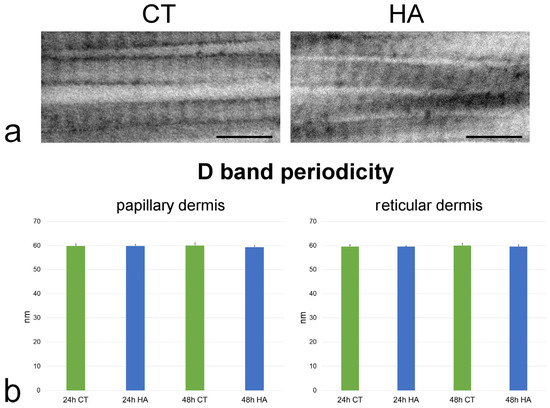 The high resolution of TEM allowed us to observe some changes induced by HA treatment also at the level of individual collagen fibrils. Fibril size significantly increased after 24 h HA treatment in both papillary and reticular dermis, but the D band periodicity did not change, thus excluding alterations in collagen monomer assembly. It is known that, when collagen fibrils are hydrated, water molecules penetrate the intrafibrillar space, and this influx of water causes fibril swelling, leading to an increase in their diameter [45]. HA attracts and holds water, enhancing the collagen swelling effect, while HA depletion induces reduction of the fibril size [46]. The parallel decrease in interfibrillar distance observed in both papillary and reticular dermis after 24 h HA treatment is likely a consequence of the enlargement of fibril size. Accordingly, some studies showed that hydration modulates protein interactions within the collagen fibrils, thus influencing their separation [47,48].