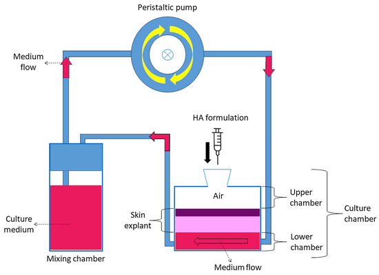 Healthy human skin samples were obtained as waste material from reduction breast surgery performed on a 51-year-old female patient, in compliance with the Declaration of Helsinki of the World Medical Association and signed informed consent. During transportation from the operating room to the research laboratory, the skin explants were kept at 4 °C. Upon arrival, the skin samples were quickly washed at room temperature in a physiological solution (0.9% w/v NaCl) and then in pre-warmed culture medium at 37 °C (DMEM medium, supplemented with 10% v/v fetal bovine serum, 1% v/v penicillin-streptomycin, 1% v/v L-glutamine, and 0.5% w/v amphotericin B). All reagents were purchased from ThermoFisher Scientific Inc. (Waltham, MA, USA). The subcutaneous fatty tissue was removed to expose the dermis. Circular samples with a diameter of 1.5 cm were cut and mounted in the bioreactor chambers (IV-Tech, Massarosa, Lucca, Italy) (Figure 8), with the stratum corneum facing upward (in contact with air) and the dermis facing downward (in contact with the circulating culture medium). This setting mimics the physiological condition of human skin with the epidermis exposed to the air and supplied with nutrients by the underlying dermis by diffusion.