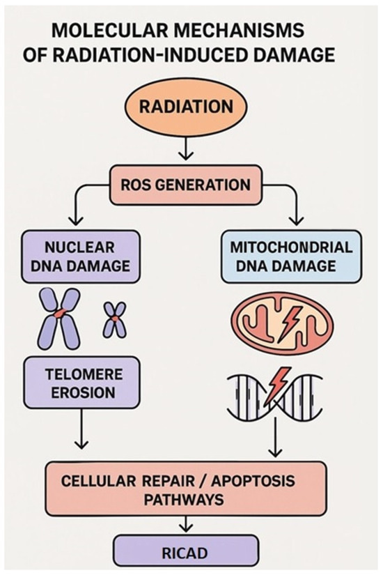 Molecular mechanisms of radiation-induced damage. Infographic showing ROS generation, nuclear vs. mitochondrial DNA damage, telomere erosion, and the activation of cellular repair/apoptosis pathways, as well as their role in radiation-induced coronary artery disease.