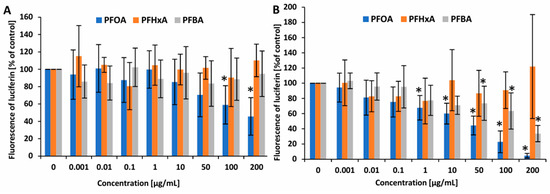 Changes in ATP level in PBMCs incubated with PFOA, PFHxA, and PFBA at concentrations ranging from 0.001 to 200 µg/mL for 1 h (A) and 24 h (B). Mean ± SD was calculated from three individual experiments (three blood donors). The asterisk indicates significant differences from negative control (p < 0.05). Statistical analysis was performed using one-way analysis of variance and Tukey’s test.