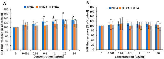 Changes in the level of ROS (A) and in the level of hROS (B) in PBMCs incubated with PFOA, PFHxA, and PFBA at concentrations of 0.001 to 50 µg/mL after 1 h of incubation. Mean ± SD was calculated from five individual experiments (five blood donors). The asterisk indicates significant difference from negative controls (p < 0.05). Statistical analysis was performed using one-way analysis of variance and Tukey’s test.