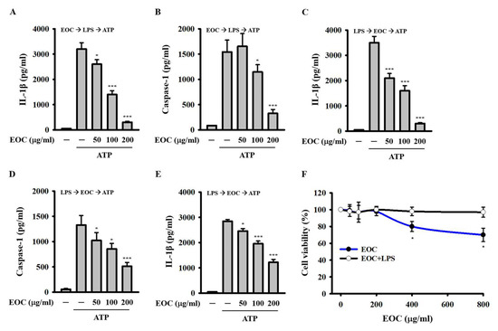 Effect of EOC on NLRP3 inflammasome activation induced by ATP. (A,B) J774A.1 macrophages were preincubated with EOC for 0.5 h, followed by treatment with 1 μg/mL LPS and 5 mM ATP. The expression of IL-1β (A) and active caspase-1 (B) in the supernatants was analyzed using ELISA. (C,D) 1 μg/mL LPS-primed J774A.1 macrophages were stimulated with 5 mM ATP. The expression of IL-1β (C) and active caspase-1 (D) in the supernatants was analyzed using ELISA. (E) 1 μg/mL LPS-primed THP-1 macrophages were activated with 5 mM ATP. The supernatant IL-1β levels were quantified using ELISA. (F) J774A.1 macrophages were incubated with EOC, with or without 1 μg/mL LPS, for 24 h. Cell viability was evaluated using the Alamar Blue assay. ELISA and cell viability results are presented as mean ± SD from three independent experiments. Statistical significance is indicated as * p < 0.05 and *** p < 0.001 compared to ATP-activated (A–E) or control cells (F).