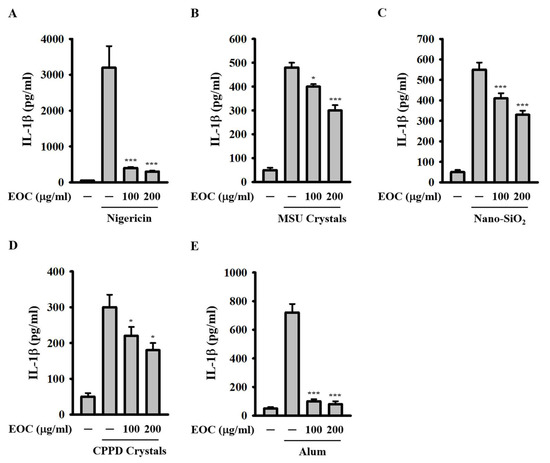 To confirm the inhibitory activity of EOC on the NLRP3 inflammasome, we tested its effect on IL-1β expression in macrophages activated by various NLRP3 activators, other than ATP. 1 μg/mL LPS-primed J774A.1 macrophages were incubated with EOC for 0.5 h, followed by activation with 10 μM nigericin for 0.5 h, or with 100 μg/mL monosodium urate (MSU) crystals, 100 μg/mL SiO2 nanoparticles (Nano-SiO2), 10 μg/mL calcium pyrophosphate dihydrate (CPPD) crystals, and 100 μg/mL aluminum hydroxide (Alum) for 24 h. Using ELISA, we found that EOC at concentrations of 100 or 200 μg/mL significantly decreased IL-1β expression in macrophages activated by nigericin (Figure 2A), MSU crystals (Figure 2B), Nano-SiO2 (Figure 2C), CPPD crystals (Figure 2D), and Alum (Figure 2E). These results indicate that EOC inhibits the NLRP3 inflammasome activated by multiple NLRP3 activators.