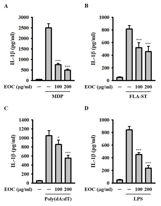 Effect of EOC on IL-1β expression induced by multiple NLRP3 inflammasome activators. 1 µg/mL LPS-primed (A–C) or 1 µg/mL Pam3CSK4-primed (D) J774A.1 macrophages were incubated with EOC for 0.5 h, followed by transfection with 10 µg/mL MDP (A), 1 µg/mL FLA-ST (B), 2 µg/mL Poly(dA:dT) (C), and 2 µg/mL LPS (D). The levels of IL-1β in the supernatants were measured using ELISA. Results are presented as mean ± SD from three independent experiments. Statistical significance is indicated as * p < 0.05 and *** p < 0.001 compared to cells activated by the inflammasome.