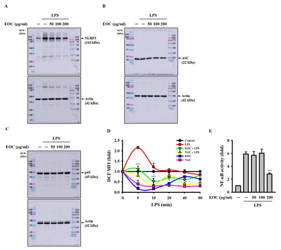 The effect of EOC on priming signals of the NLRP3 inflammasome. (A–C) J774A.1 macrophages were treated with EOC for 0.5 h, followed by 1 μg/mL LPS activation for 6 h. The protein expression of NLRP3 (A), ASC (B), and caspase-1 (p45) (C) were measured using Western blot. (D) J774A.1 macrophages were treated with 100 μg/mL EOC for 0.5 h, followed by 1 μg/mL LPS activation for 5 to 80 min. The cells were stained with 2 μM CM-H2DCFDA and analyzed using a spectrophotometer. (E) NF-κB reporter cells were incubated with EOC for 0.5 h and then activated with 1 μg/mL LPS for 24 h. The NF-κB transcriptional activity was measured using QUANTI-Blue solution. ROS and NF-κB results are presented as mean ± SD from three independent experiments. Statistical significance is indicated as * p < 0.05 and *** p < 0.001 compared to LPS-activated cells.
