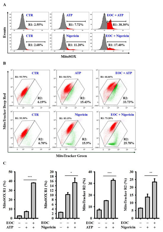 The effect of EOC on the mitochondrial damage. 1 μg/mL LPS-primed J774A.1 macrophages were incubated with 100 μg/mL EOC for 0.5 h and then activated with 5 mM ATP or 10 μM nigericin for an additional 0.5 h. The cells were stained with 5 nM MitoSOX (A) or with a combination of 25 nM MitoTracker Deep Red and 25 nM MitoTracker Green (B) for 15 min. The fluorescence signals were then analyzed using flow cytometry. The flow cytometry images represent individual experiments, while the histogram provides quantification expressed as the mean ± SD for these three experiments (C). Statistical significance is indicated as * p < 0.05, ** p < 0.01 and *** p < 0.001.