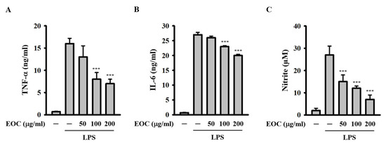 To assess the effect of EOC on the expression of TNF-α, IL-6, and the production of NO, J774A.1 macrophages were incubated with EOC for 0.5 h, followed by activation with 1 µg/mL LPS for 24 h. The concentrations of TNF-α and IL-6 in the supernatants were measured by ELISA, while the NO concentration in the supernatants was determined using the Griess reaction.
