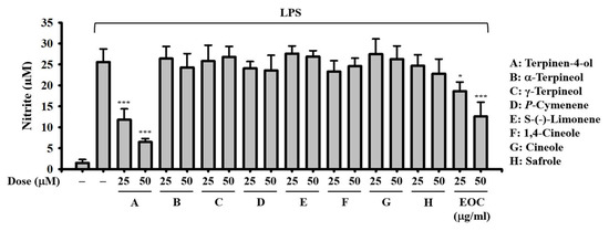 Effect of major compounds of EOC on NO production. 774A.1 macrophages were incubated with 25 and 50 μM test compounds or 25 and 50 μg/mL EOC for 0.5 h and then activated with 1 μg/mL LPS for 24 h. The NO production in the supernatants was measured using the Griess reaction. The results are presented as mean ± SD from three independent experiments. Statistical significance is indicated as * p < 0.05 and *** p < 0.001 compared to the LPS-activated cells.