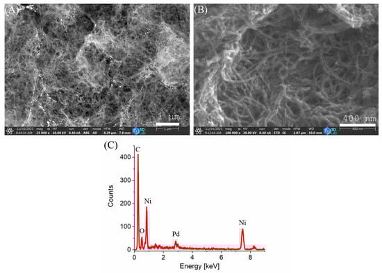 The morphology of the prepared catalyst was examined using scanning electron microscopy (SEM). SEM images taken at two different magnifications and detectors are presented in Figure 1. In Figure 1A, on the surface of the carbon support, glowing white Pd nanoparticles can be seen. In higher magnification (Figure 1B), the characteristic dense fibrous structure of the carbon nanotubes, interconnected and stabilized by a carbonized alginate framework, is visible. Elemental analysis was also performed by energy-dispersive X-ray spectroscopy (EDS) (Figure 1C). The analysis revealed characteristic peaks associated with the expected elements: carbon (C), oxygen (O), palladium (Pd), and nickel (Ni).
